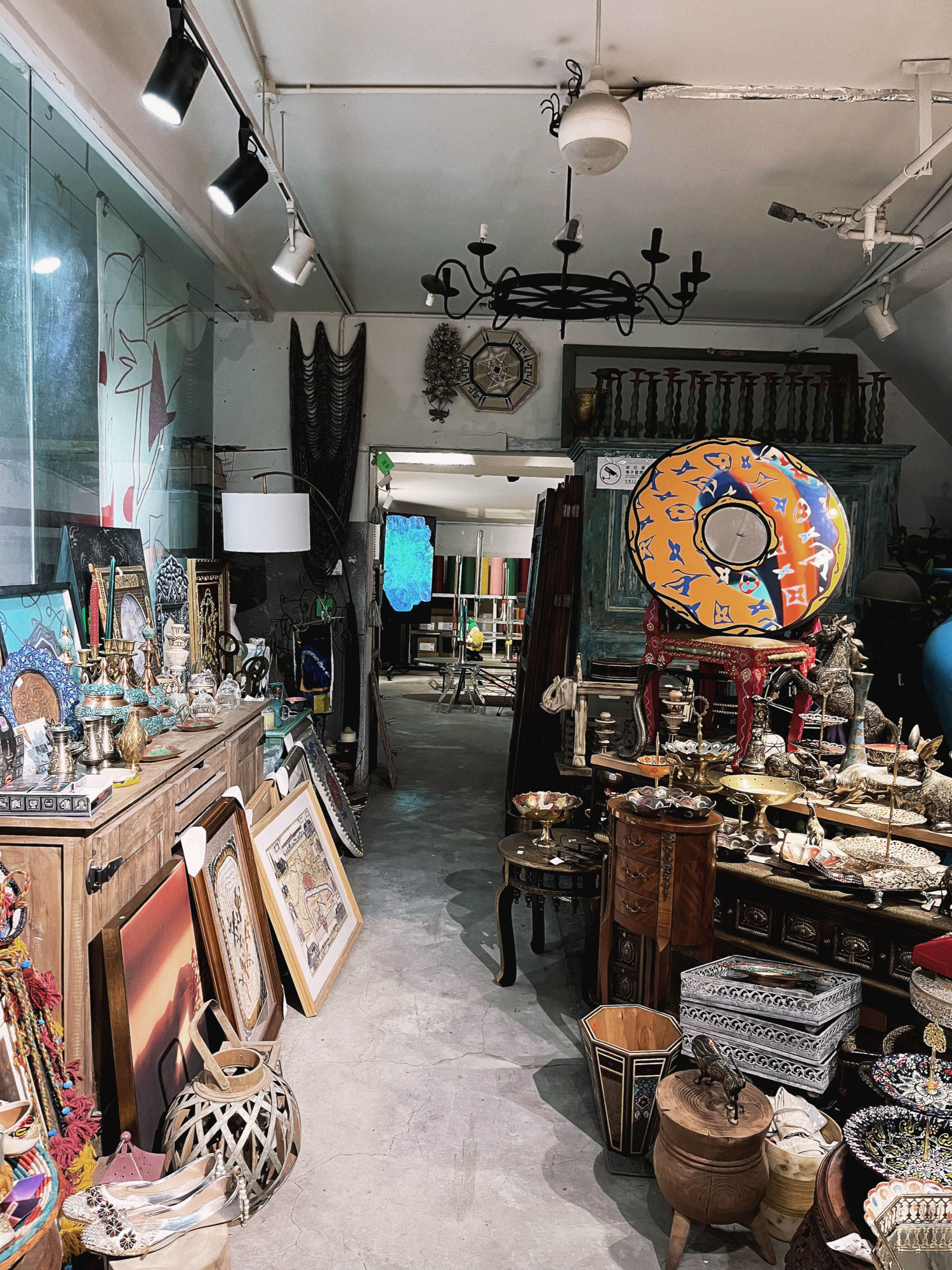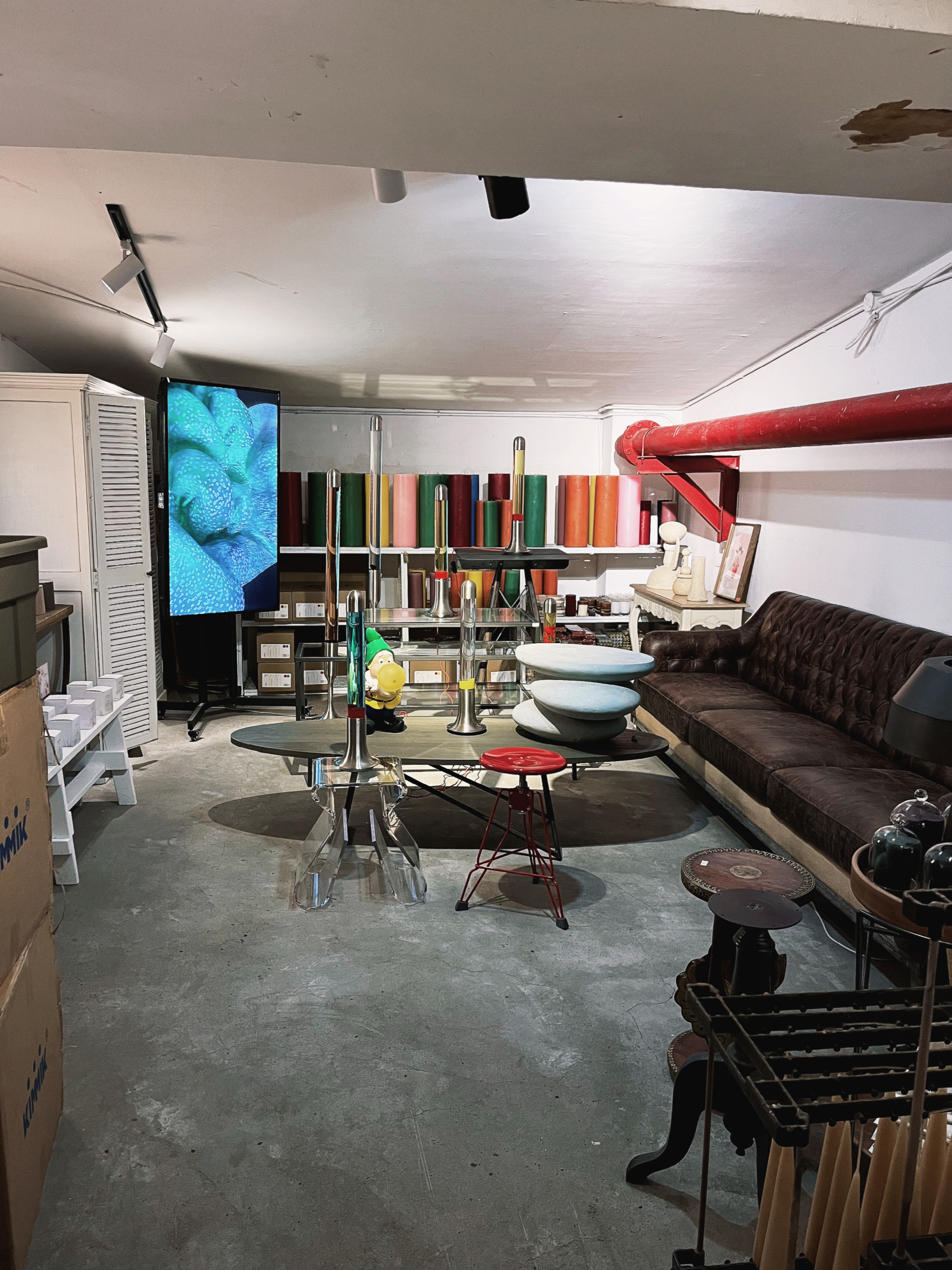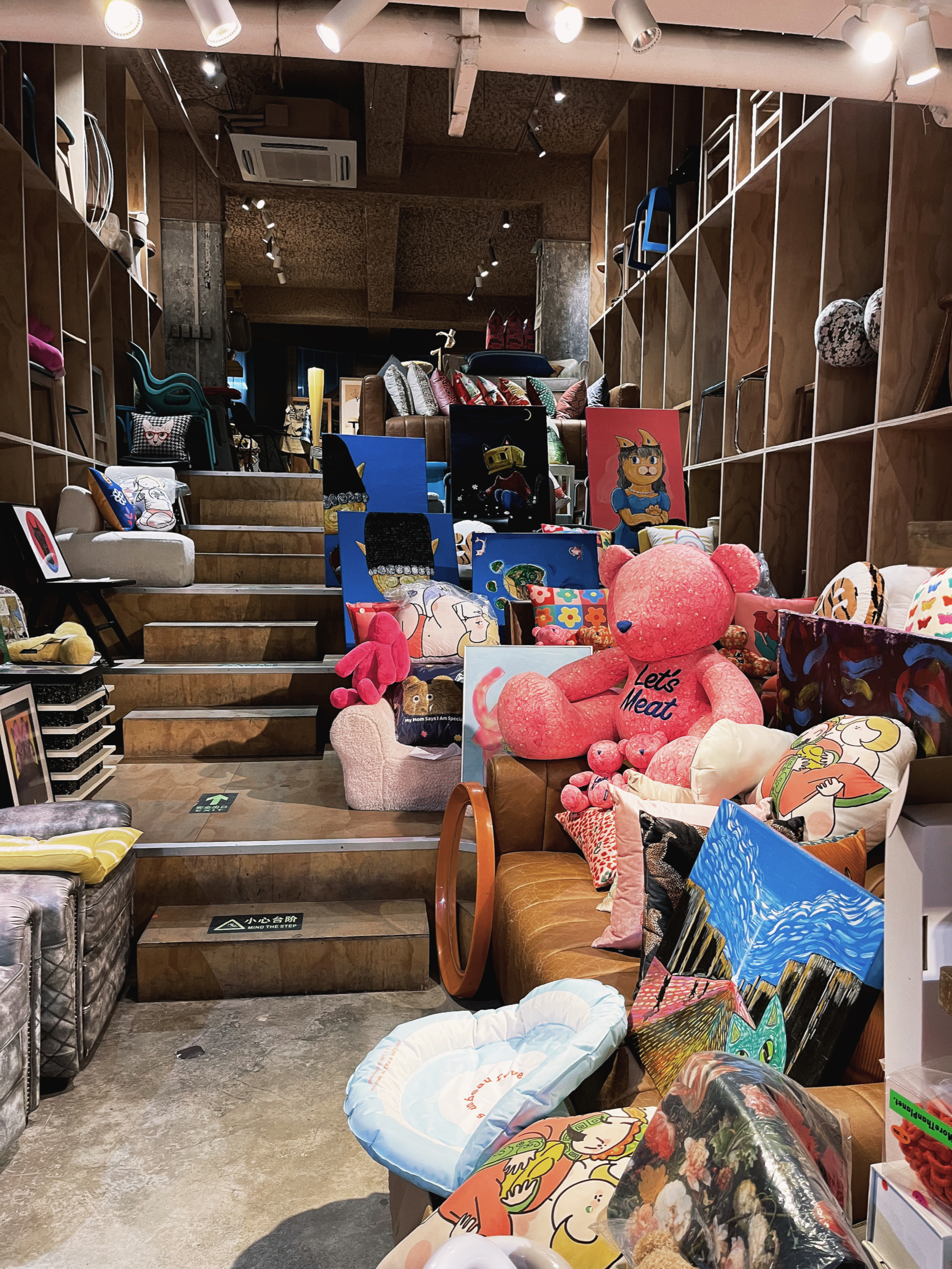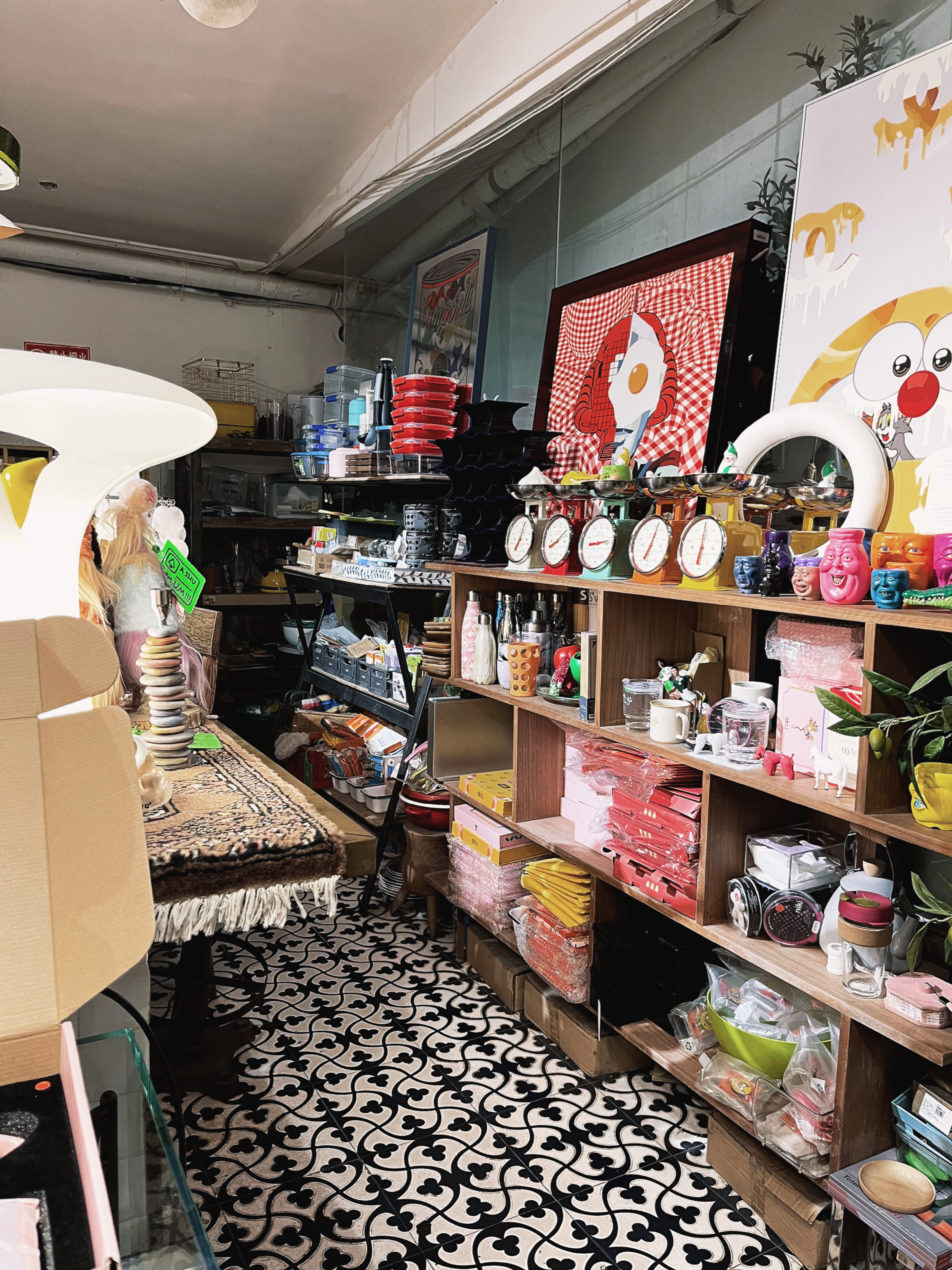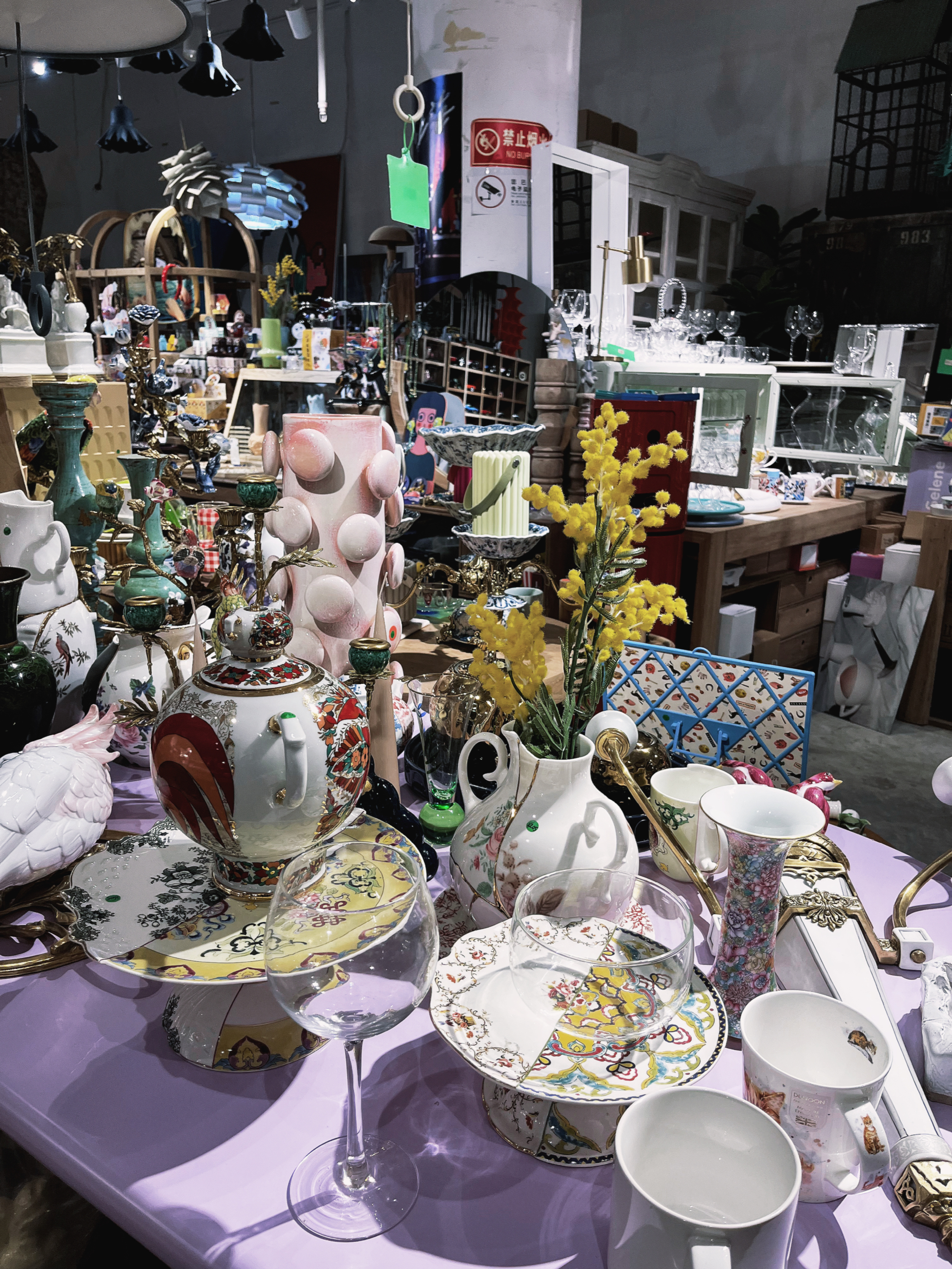 沙发椅子、蜡烛杯子、首饰古着……各种复古商品琳琅满目,没想到街面上看起来平平无奇的一栋商务楼,地下竟藏着这么大一个生活方式集合店,集中古家具、服饰、潮玩以及国内外艺术家的设计为一体。