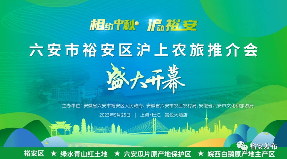 在松江 一天看遍 500里茶谷 800里大别山 1000里淠史杭 您能在裕安农旅推介会上 感受生活在别处的美妙与精彩 也能与朋友们 知晓裕安 山水自然、人文历史 风味特产、非遗文化、民俗烟火 9月25日 “相约中秋 沪动裕安”六安市裕安 区沪上农旅推介会将正式举办 一、活动主题 相约中秋 沪动裕安 二、活动时间 2023年9月25日 三、活动地点 上海市松江区富悦酒店富悦1-2厅 四、举办单位 主办单位: 安徽省六安市裕安区人民政府 安徽省六安市农业农村局 安徽省六安市文化和旅游局 承办单位: 安徽省六安市裕安区农业农村局 安徽省六安市裕安区文化和旅游局 安徽省六安市裕安区发展和改革委员会 协办单位: 安徽省六安市裕安区茶叶产业协会 安徽省六安市裕安区皖西白鹅产业协会 安徽省六安市裕安区农产品上海运营中心 支持单位: 上海市松江区人民政府办公室