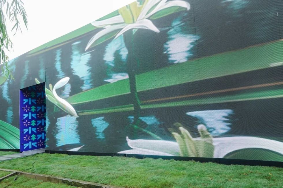记者在现场看到,主展区类似一座集装箱。据悉,其设计灵感和材料来源于上海自贸试验区特有的海运集装箱元素,紧密关联着外高桥深厚的发展史与其核心功能。而建筑外立面37米长的巨型投屏播放艺术家王点的大型影像作品“百合”,展现自然的循环与纯洁,体现人与自然和谐共生的思想,也呼应了森兰在绿化建设中对于植被花卉选择的深远思考。建筑内部在展示艺术季成果的同时,还兼具了展览、休闲、驳船等综合功能。