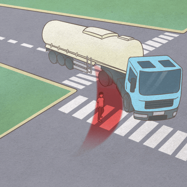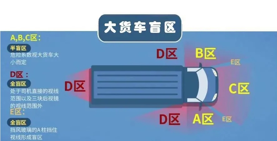 由于大货车轮胎大,驾驶室高,驾驶人借助后视镜观察侧面路况时仍存在看不到的区域,这就是盲区。