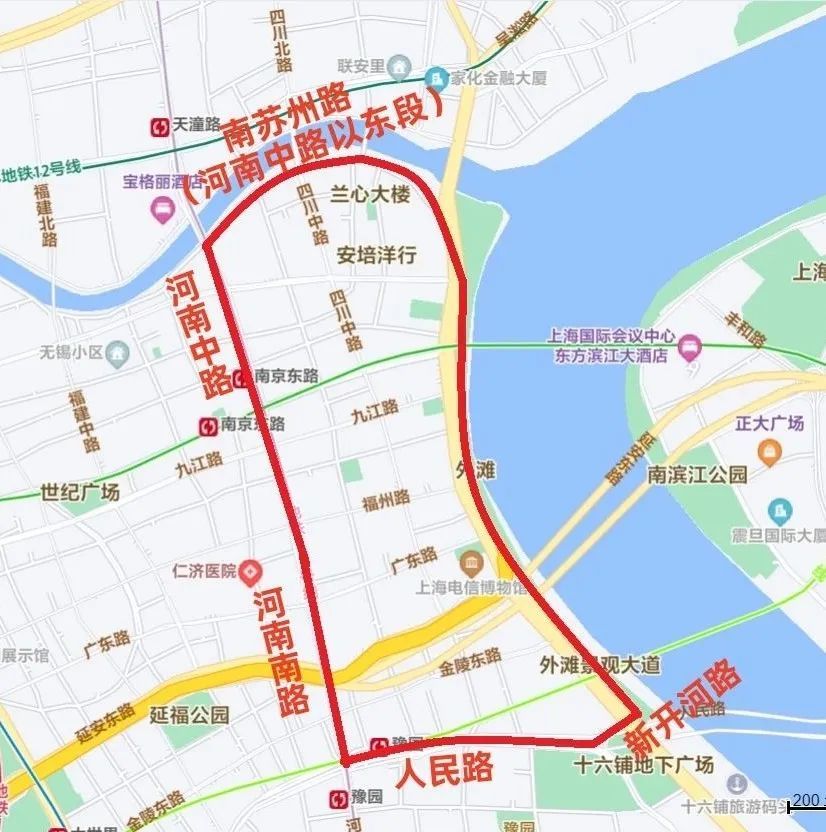 沿南苏州路(河南中路以东段)—河南中路—河南南路—人民路—新开河路及黄浦江边所围合区域内的道路(含上述道路),禁止非机动车通行。