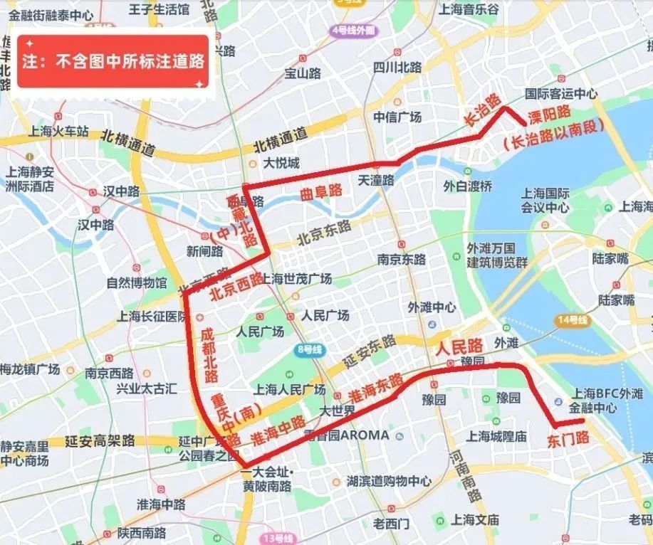 沿溧阳路(长治路以南段)—长治路—天潼路—曲阜路—西藏北路—西藏中路—北京西路—成都北路—重庆中路—重庆南路—淮海中路—淮海东路—人民路—东门路及黄浦江边所围合区域内的地面道路(不含上述道路)禁止机动车通行。