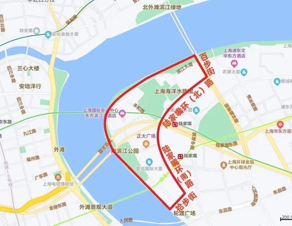 沿百步街—陆家嘴环(北)路—陆家嘴环(南)路—拾步街及黄浦江边所围合区域内的道路(不含上述道路),禁止机动车通行。