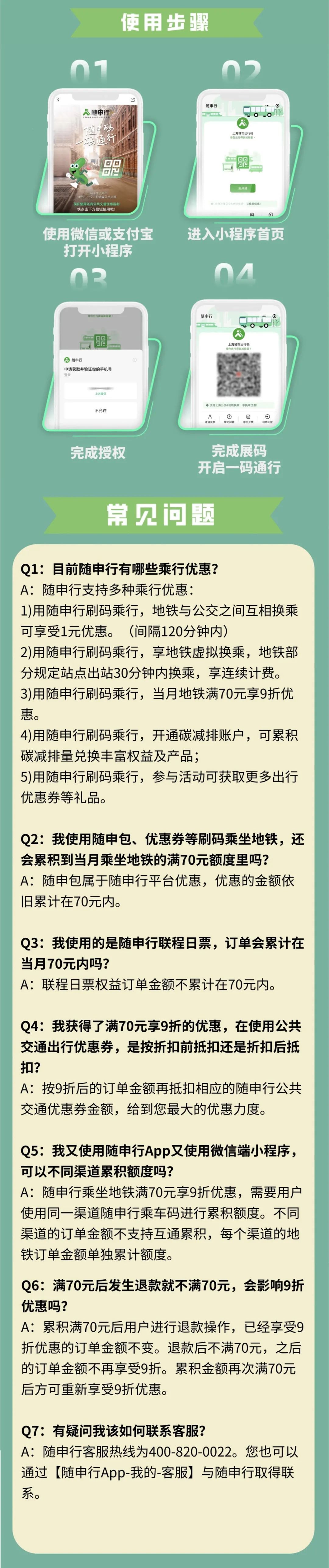 继上海“出行即服务”(MaaS)系统上线19.8元“联程日票”后,使用“随申码”乘地铁满70元享9折优惠也在今天全面上线,绿色出行福利多多,跟小交一起了解一下吧~