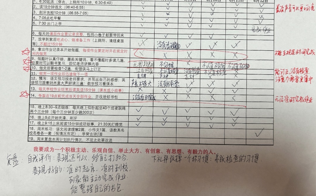 除此之外,学校生活还有哪些挑战?家长可以通过家庭会议的形式,和孩子一起梳理一下,并一条一条记录下来,并制作假期之中和后续的“任务表格”。