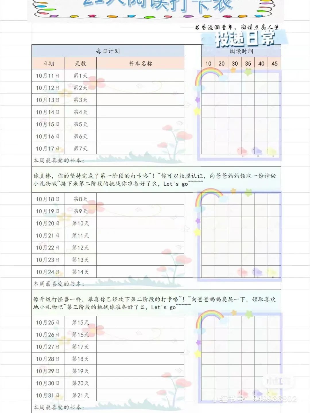 她给大家推荐使用“阅读打卡单”:孩子读了什么书,自己把书名写好,并记录或画一画这本书的主要内容。也可以让小朋友给爸爸妈妈或喜欢的玩偶讲一讲书里的故事,等等。