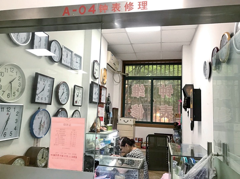 服务中心A04摊位是施贤辉的钟表修理铺。玻璃门上贴着的价目表显示:小配件、换电池、国产表擦洗修理、进口表修理,收费1元~500元不等,约8平方米的小铺墙上挂满了待修、修好待取的挂钟。“施师傅,手表玻璃壳碎了可以换吗?”记者才与摊主聊上没几句,便有一位顾客上门询问。“你把表拿来看看。”施师傅招呼道。
