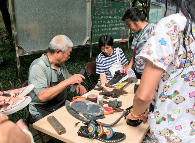 胡师傅的修鞋摊位刚支好,就已经有3位妇女在一旁等候了。最先到的一位阿姨为女儿的风凉皮鞋重新换后跟,20分钟左右就修好了,阿姨很满意,付了15元。1小时不到,胡师傅修了3双皮鞋、1双旅游鞋。交谈中记者了解到,胡师傅在淮海中路长春食品店旁边的弄堂内常年摆摊修鞋;现在,每月两次参加由街道组织的“巧匠进社区”公益服务。