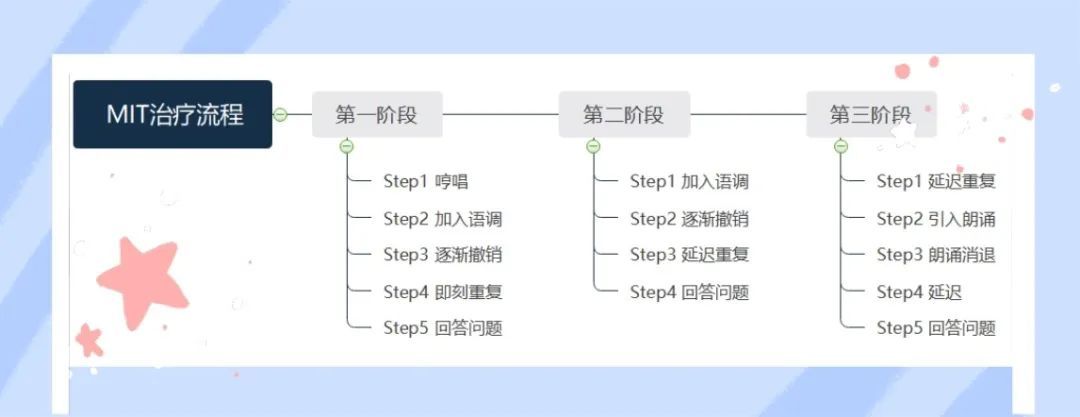 MIT结构分明,难度循序渐进。在治疗时,言语治疗师需要配合一定技巧,严格按照分级进行,见下图,简单展示了三个不同阶段的治疗流程。