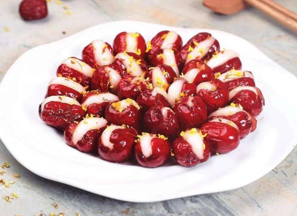 材料:红枣,糯米粉,桂花干、白砂糖、白芝麻适量