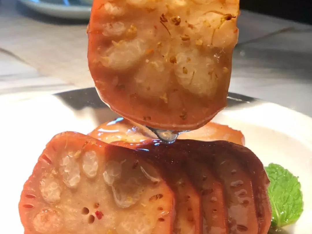 切片装盘后在莲藕表面淋上桂花酱即可。