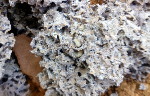 蚁路是白蚁外出活动和取食的通道。白蚁用分泌的液体,把泥土、排泄物和木屑等粘合而成,形似条状、 半月状,呈黄褐色。