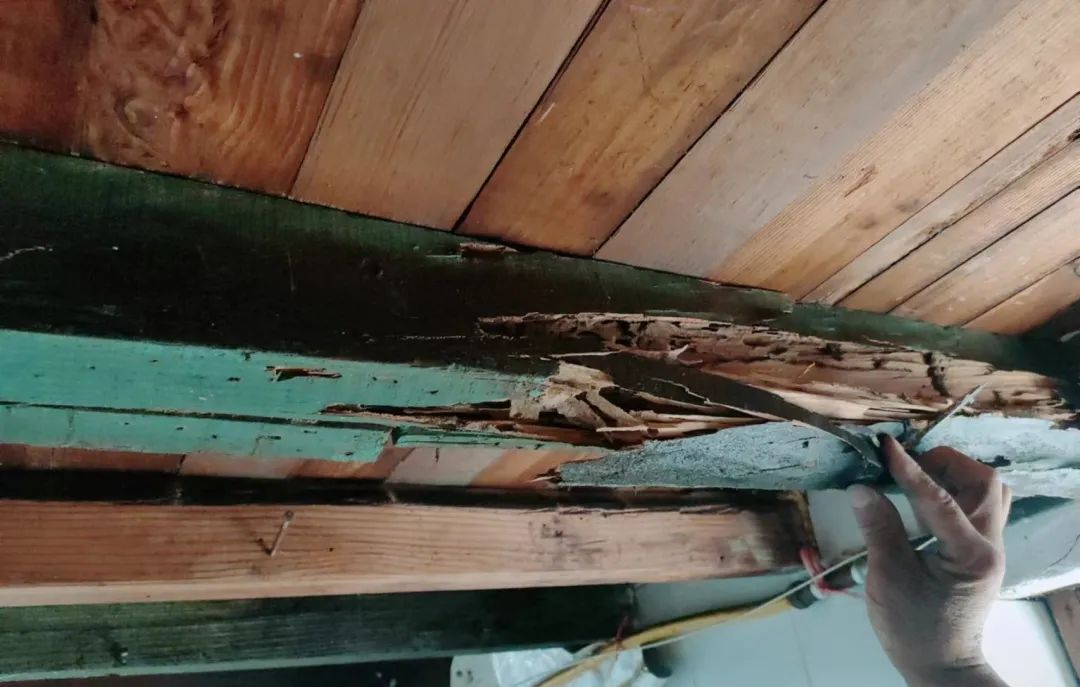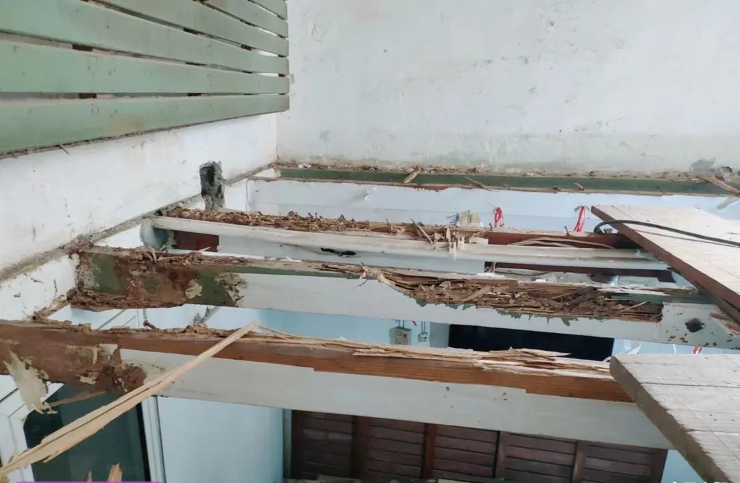 在大家的劝说下,梁先生终于同意继续检查。当卧室的吊顶被掀开后,房顶上展露的情况令他大吃一惊。卧室里6根粗壮的房梁已被白蚁蛀蚀,用手指轻轻戳一下,木头就裂了。其中还有2根房梁已被白蚁啃食得只剩下细细一条,远远看去就像两根细木棍搭在房间上方。