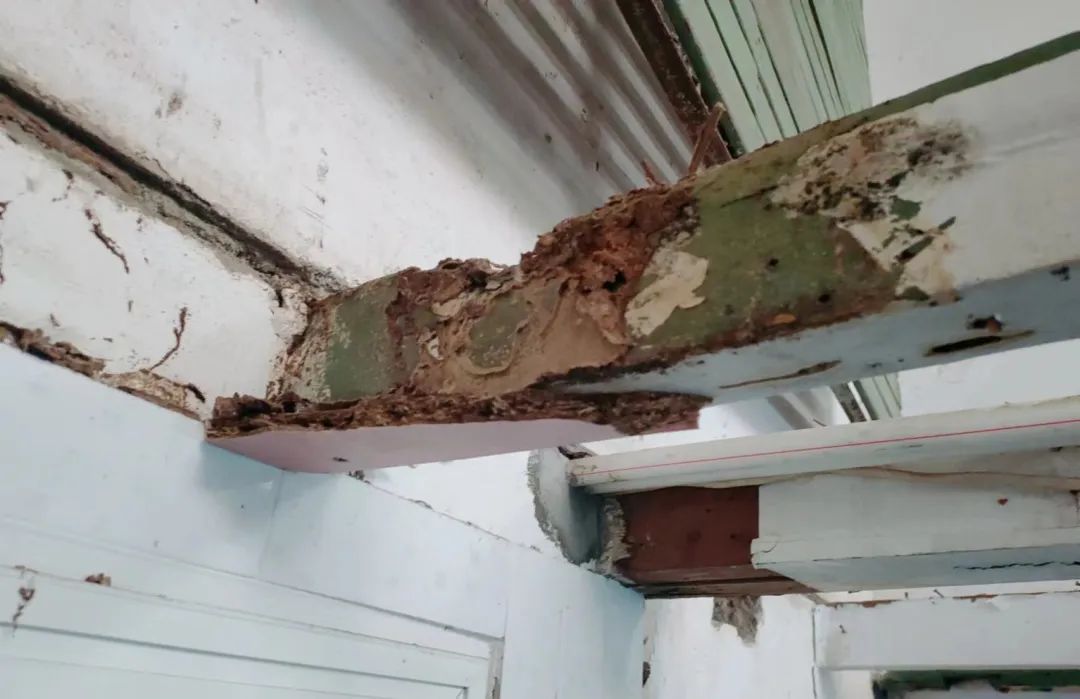 支撑房屋的木梁被全部蛀空,失去了承重作用,已不再适合居住。经过协调,梁先生暂时搬离了房屋,华阳物业工程部立即启动了白蚁防治和房屋修缮工程。经过10天的紧张施工,被白蚁肆虐的老洋房焕然一新。