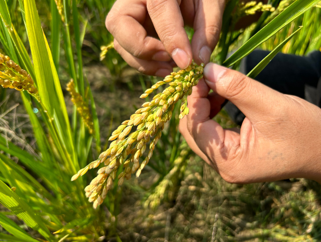 “今年中秋国庆假期遇到几天阴天低温,那几天水稻不灌浆,延迟了生长速度,眼见着秋收要晚一点。”邵立昌走在粳稻田间,边说边托起一束稻穗,用指甲分别掐掐顶端和底端稻粒,底端的稻粒随之冒出白色浆汁。他告诉记者,“稻穗从顶端向底端逐渐成熟。你看,这穗子顶端已经成熟了,掐起来是硬的,但底端粒子一掐还冒白浆,就是还没长好。这稻穗下的小茎秆也是绿色的,还没变黄。我每天都要到田里看看。兰花塘这边, 2000亩杂交籼稻预计在10月15日至20日收割,2000亩粳稻在11月上旬收割。”