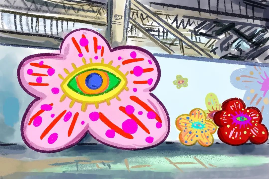 三朵长着眼睛的大小花朵,鲜艳夸张很惹人喜爱。它们三只“嚣张”地横在墙壁里静静地注视着来往行人。