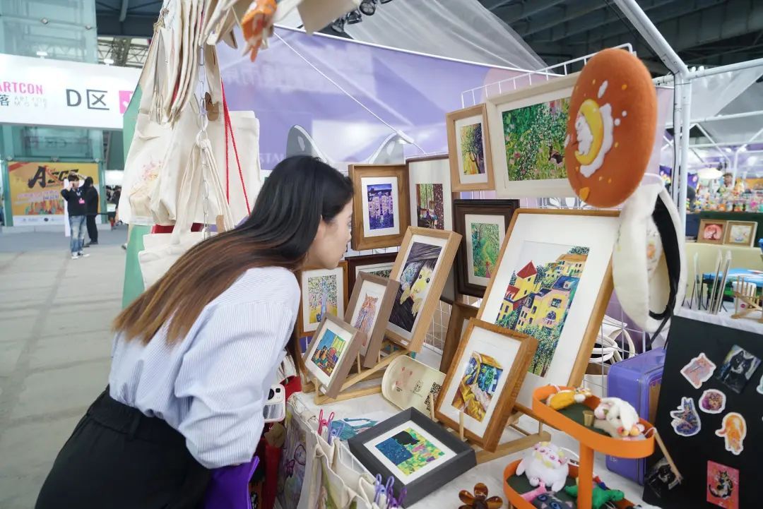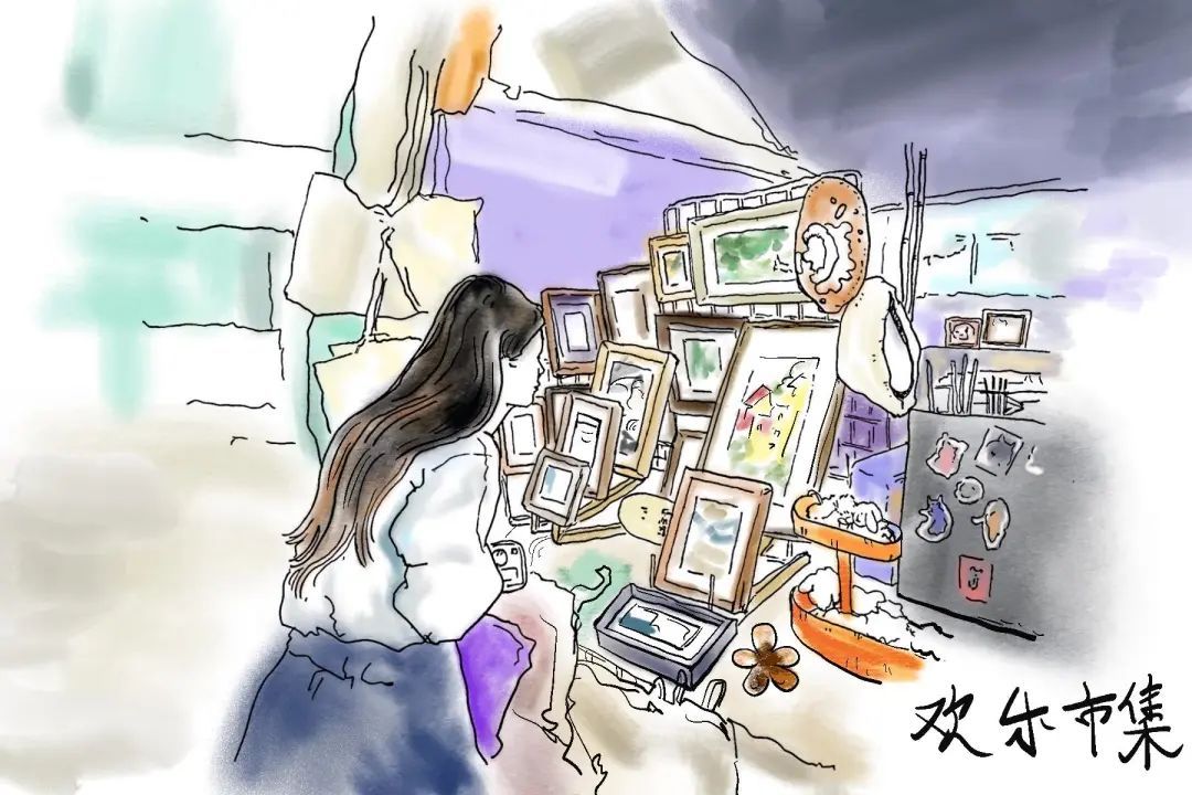 小清新小文艺的姑娘们,在市集摊位前浏览扫描自己心仪的物品。琳琅满目的装饰画,随便选一个都能装点你温馨的小窝。