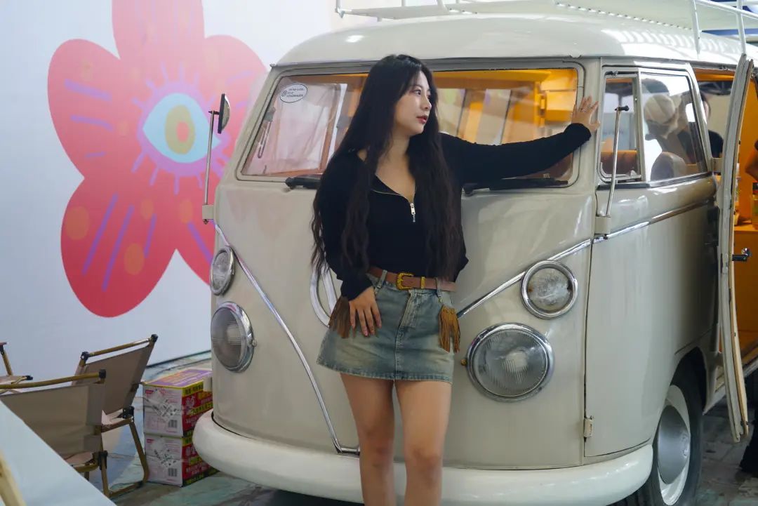 爱美的姑娘们在可爱的小车前拍照合影,这场潮人派对上有不少打扮时髦的美女们自拍留念。