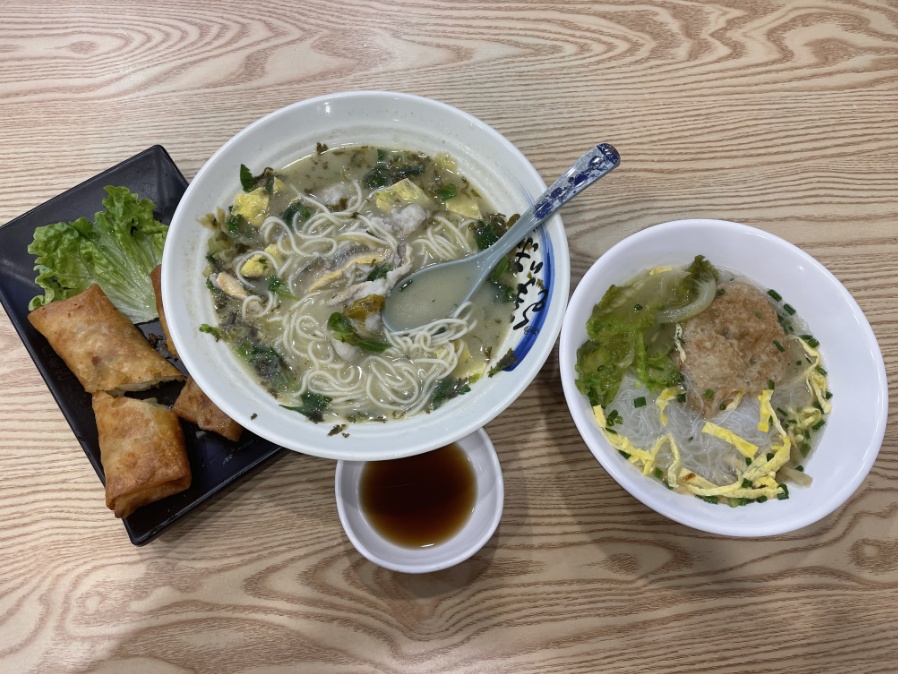 面馆的招牌菜包括黄鱼面、黄鱼春卷和小食油面筋。黄鱼面面汤发白,味道咸鲜清爽,面条配上了酸菜和约十几块鲜嫩的鱼肉。春卷里鱼肉满满,吃起来酥脆不腻。油面筋里满是猪肉,面皮由厨师亲手制作,整个有近一只拳头大小,分量十足。