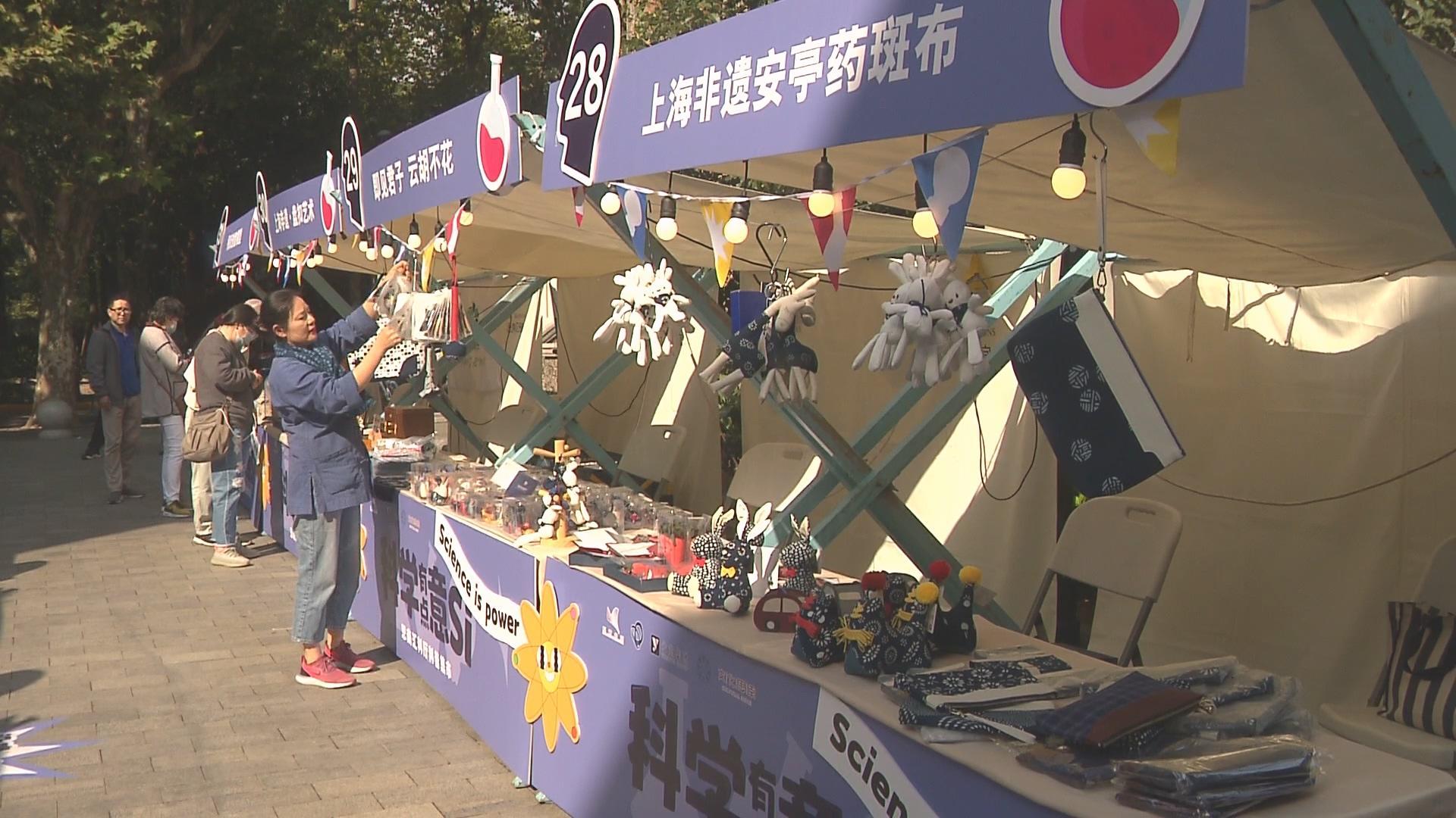 “科普+非遗”板块融合“传承、海派、互动”等元素。这是有着上千年历史的上海市非遗嘉定安亭药斑布,带来玩偶、香囊、围巾等文创产品,很受市民尤其是年轻人的喜欢。传承人胡苏芬告诉记者,嘉定安亭药斑布2009年入选上海市非遗名录,其名字来源是因为染料由板蓝根叶子发酵而成,上面的斑斑点点是由豆粉和石灰粉做成的纺染浆。石灰在古时候是入药的,又叫灰药,现在俗称蓝印花布,距今已有上千年的历史。开展没多久,摊位上就卖出了很多小兔子和小香囊等文创产品。