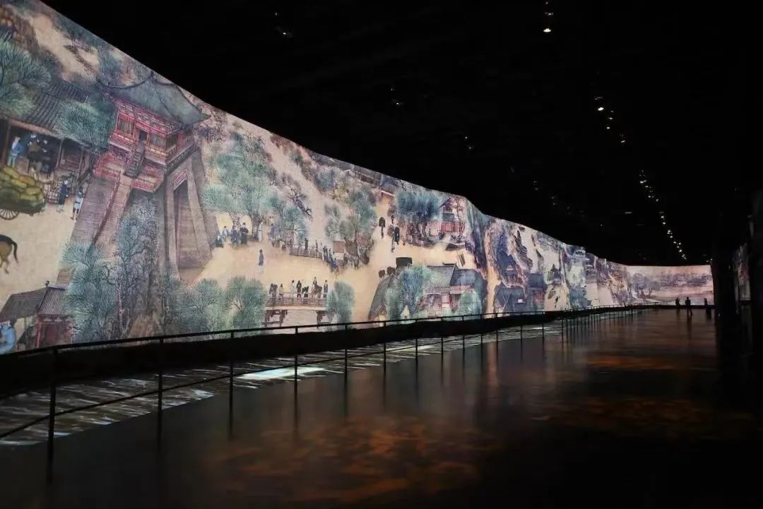 多媒体版《清明上河图》全景动态演绎北宋张择端的传世之作《清明上河图》。作品总长128米,高6.5米,将原作放大近30倍,使人仿佛置身一场古今交融的超时空对话中。画面分为白天与夜晚,每隔4分钟为一个日夜循环,再现了北宋繁华的夜市景象。