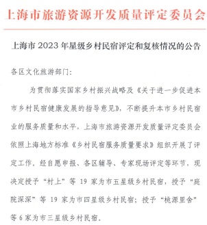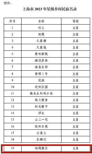 日前,上海市文化和旅游局公布了《2023年上海市星级乡村民宿名录》,闵行区杨姆酒庄民宿名列其中并荣获“五星级乡村民宿”称号!这也是闵行区首家获此殊荣的乡村民宿。
