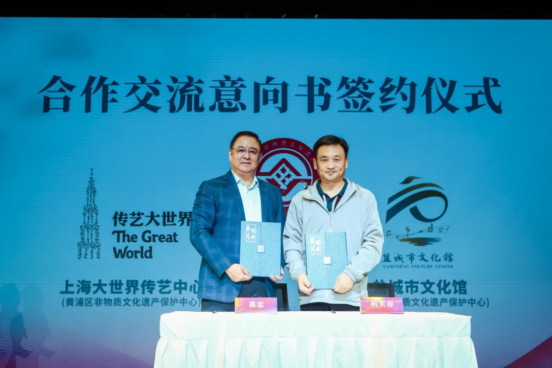 活动中,上海大世界传艺中心主任葛忠与盐城市文化馆馆长杭笑春签署合作交流意向书,就更好地保护、传承、利用和推广两地非遗工作开展深度合作交流。