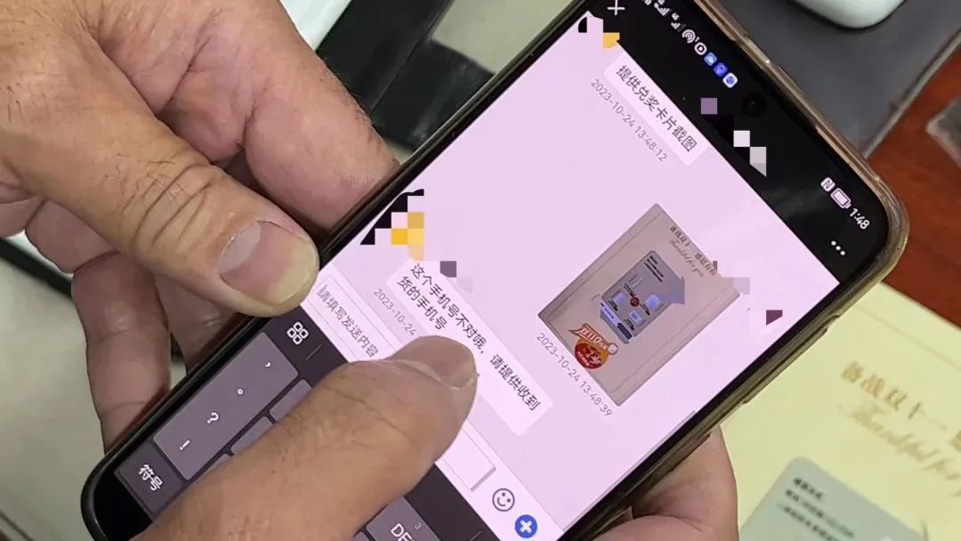 为了证明骗局,民警用自己的手机扫了卡上的二维码,跳出一个微信对话框,显示为“某团客服”,在提供了手机号和提货卡截图后,得到提示“这个手机号不对哦,请提供收到货的手机号”……