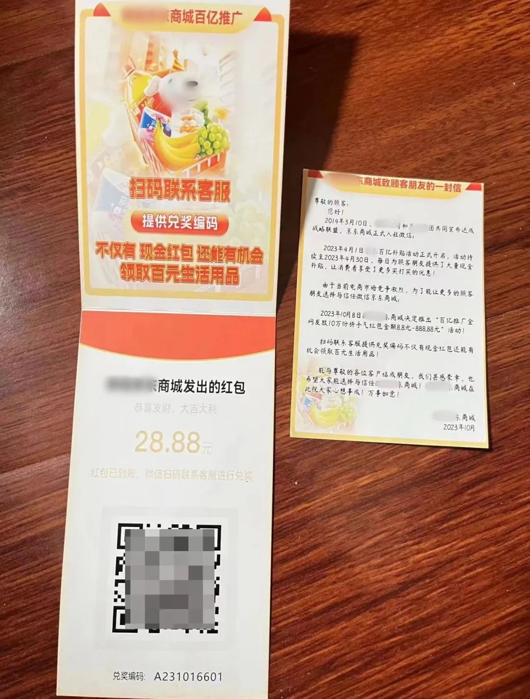 有的“提货卡”以包裹形式寄到居民手中,包裹内容丰富,不仅有一包湿纸巾,还有一封感谢信和一张红色知名品牌提货卡,卡片上写着“备战双十一,感恩有你”等字样,也同样印上了某知名企业家的图片,那张红色提货卡背面印有二维码,称扫码即可以0元兑换知名品牌电动牙刷或电饭煲等小家电。