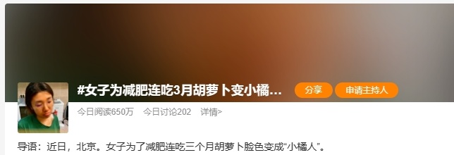 近日,北京一女子为了减肥,连吃3个月胡萝卜变成“小橘人”被推上了热搜。