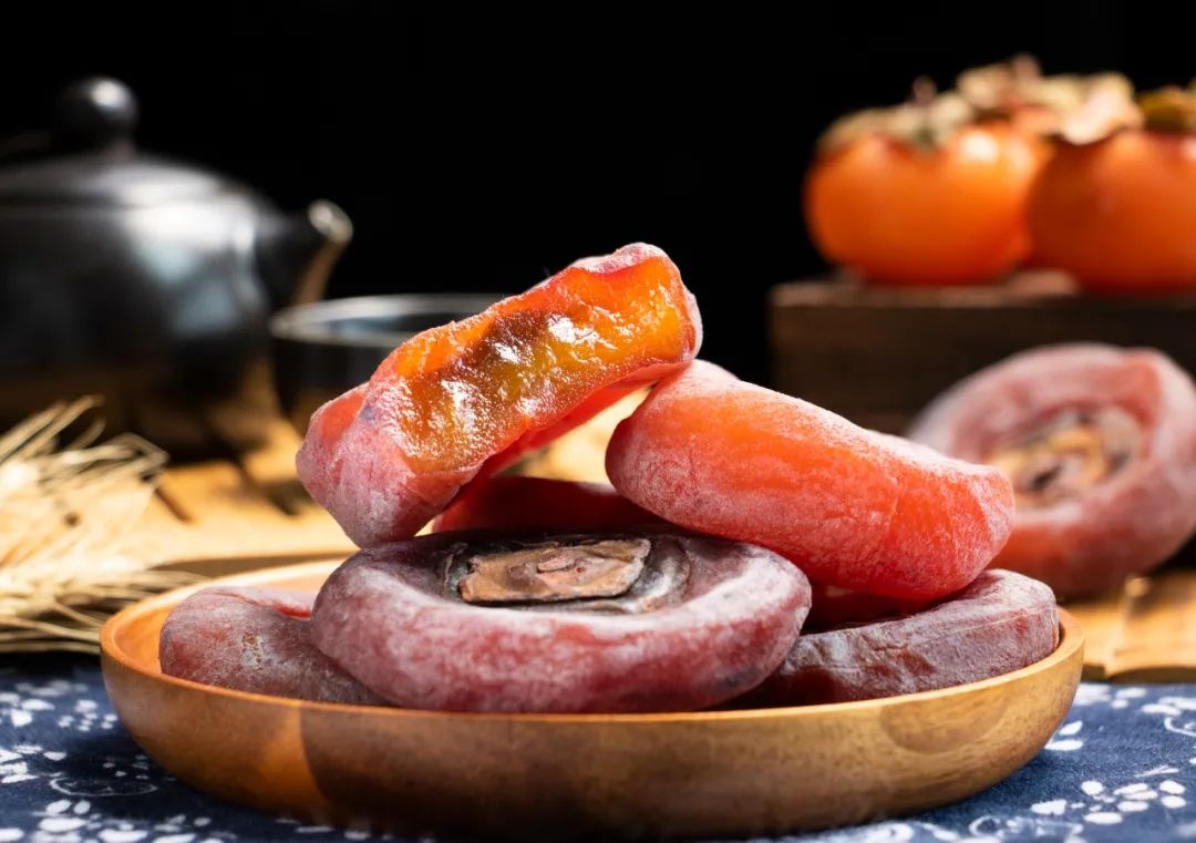 新鲜柿子还可加工制成柿饼,可润肠通便、补充能量;饼上所结的白霜,味甘、性凉,有清热生津的功效。