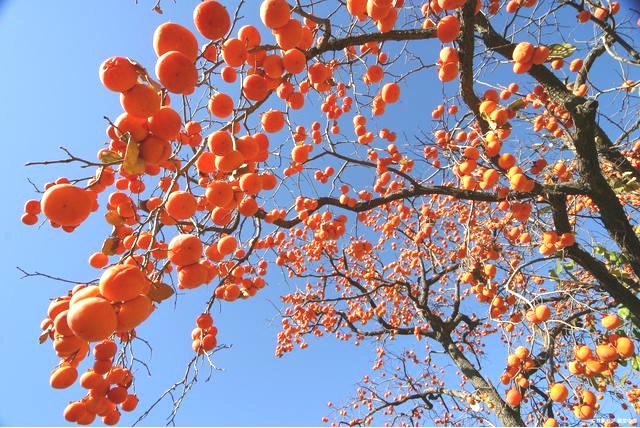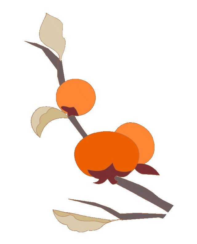 柿子原产我国长江流域,是柿科柿属的落叶乔木;在我国有2000多年的历史。其果实圆硕敦厚,柿蒂4裂,寓意四方太平;被誉为民间吉祥果。柿子的果肉绵软多汁,栽培品种通常少种子或无种子。