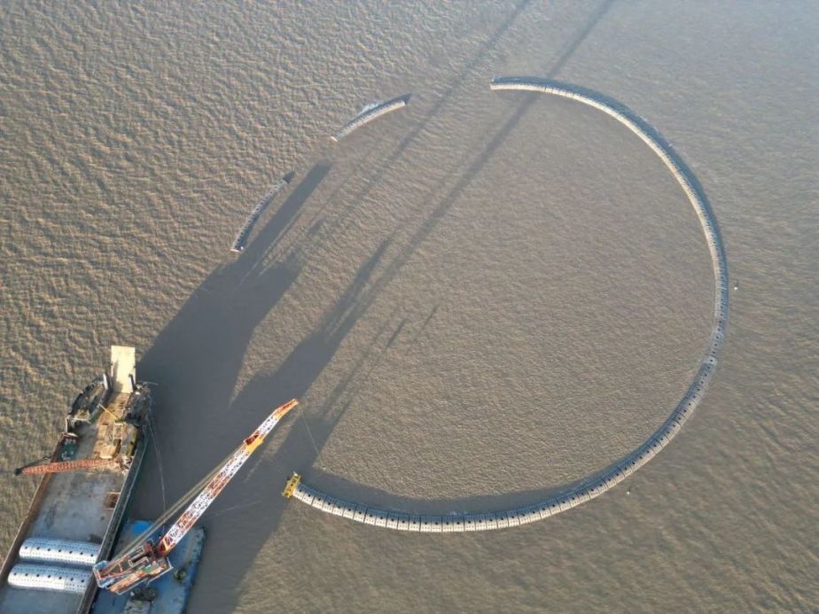 面对复杂工况,项目团队提前研究临港海域历年水文情况,编制赶潮施工方案,借助BIM技术搭建现场模型,规划水上施工区域布局,模拟各类施工船舶的走位布置与行进路线,确保水上施工安全高效。同时,项目技术团队针对牡蛎礁特有的透空式半圆体结构定制了专用夹具,在安装半圆体时将传统的人工测量定位,升级为专业测量定位软件,同步实现了全机械化吊装作业和水下可视化定位控制,有效提升了半圆体安装效率和质量。
