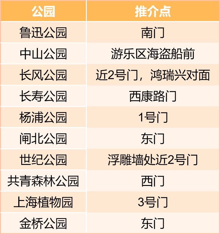 柑橘推介点分别位于鲁迅公园、中山公园、长风公园等总计10座公园。具体位置如下: