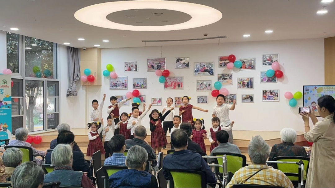 歌舞表演《勇气大爆发》、舞蹈表演《彩虹的微笑》、歌唱童谣《重阳到》、背诵古诗《九月九日忆山东兄弟》……近日,徐汇区龙华街道康文幼儿园大班的小朋友们首次走进社区养老院——怡乐家园养护院,他们用纯真的笑容和充满活力的表演,为养老院的爷爷奶奶们带来了欢乐和活力。