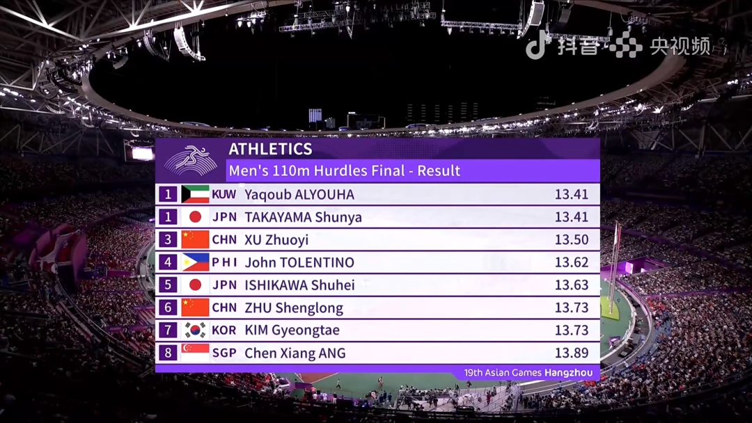 在今天(10月2日)晚上,刚刚结束的2023年杭州亚运会田径比赛男子110米栏决赛中,松江籍选手徐卓一以13秒50的优异成绩获得铜牌!