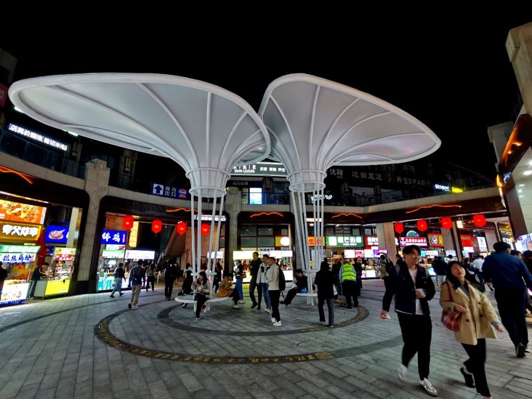 走进夜市,广场中央设置了两座荷叶造型的廊架,叶片如同雨伞,叶片下有供食客休息的座凳,不少食客正悠闲地坐着品尝美食。“去过不少夜市,一般只有商家门口的外摆座位可以坐,像这样在公共区域设置座凳的比较少见,对我们来说很方便,毕竟买了好几家的食物。”邵先生第一次来,就发现了这次改造提升的贴心变化。