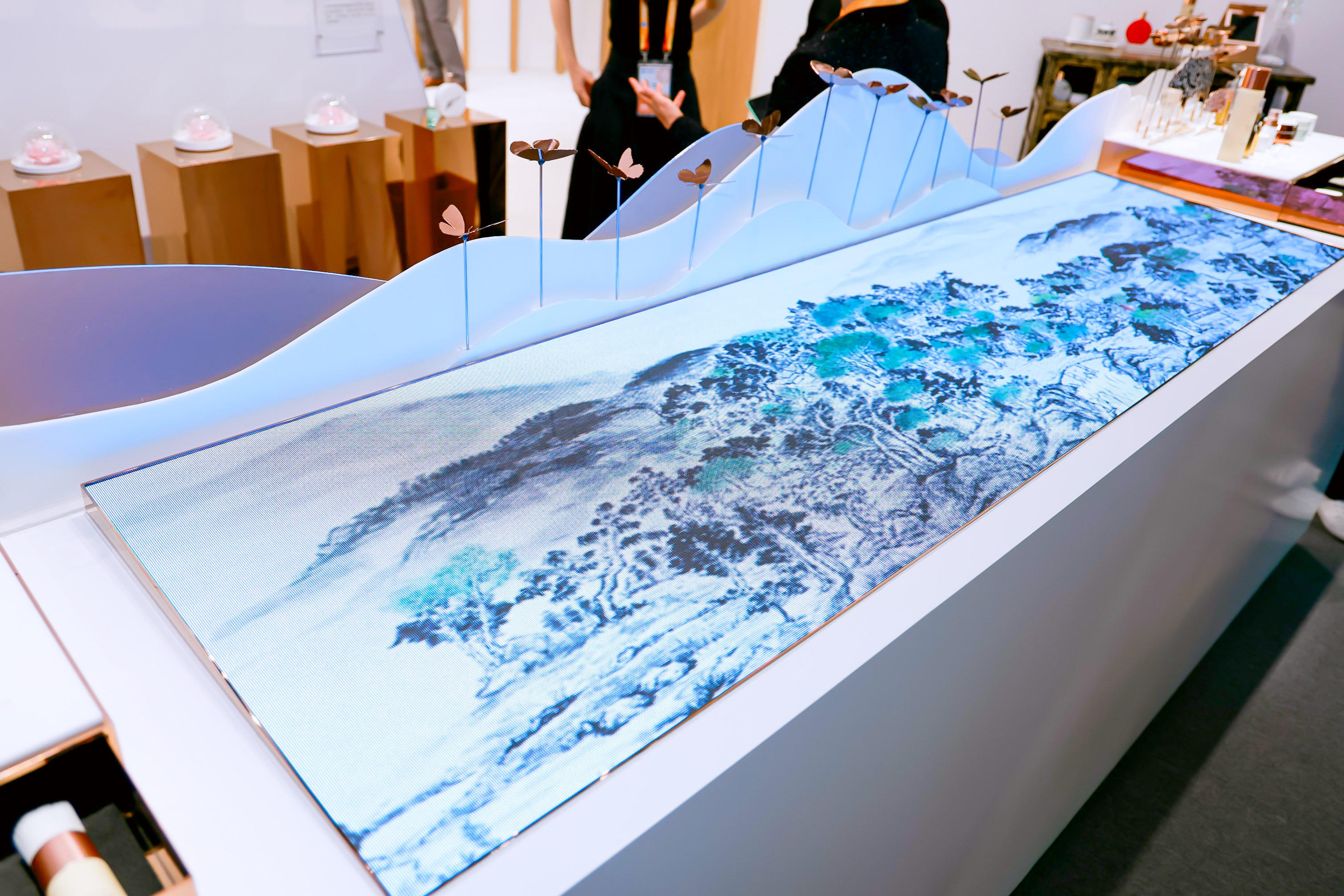在CHA LING茶灵展台,四处可见的云南斑凤蝶灵动非凡,通过互动AR体验,让人仿佛置身雨林。由知名艺术家Jason Lee李智馨创作的山水长卷《茶山的一天》还原古老景迈山布朗族部落的种茶制茶风俗,又经由CHA LING茶灵的数字化再创造生动传递出人茶共融之意。