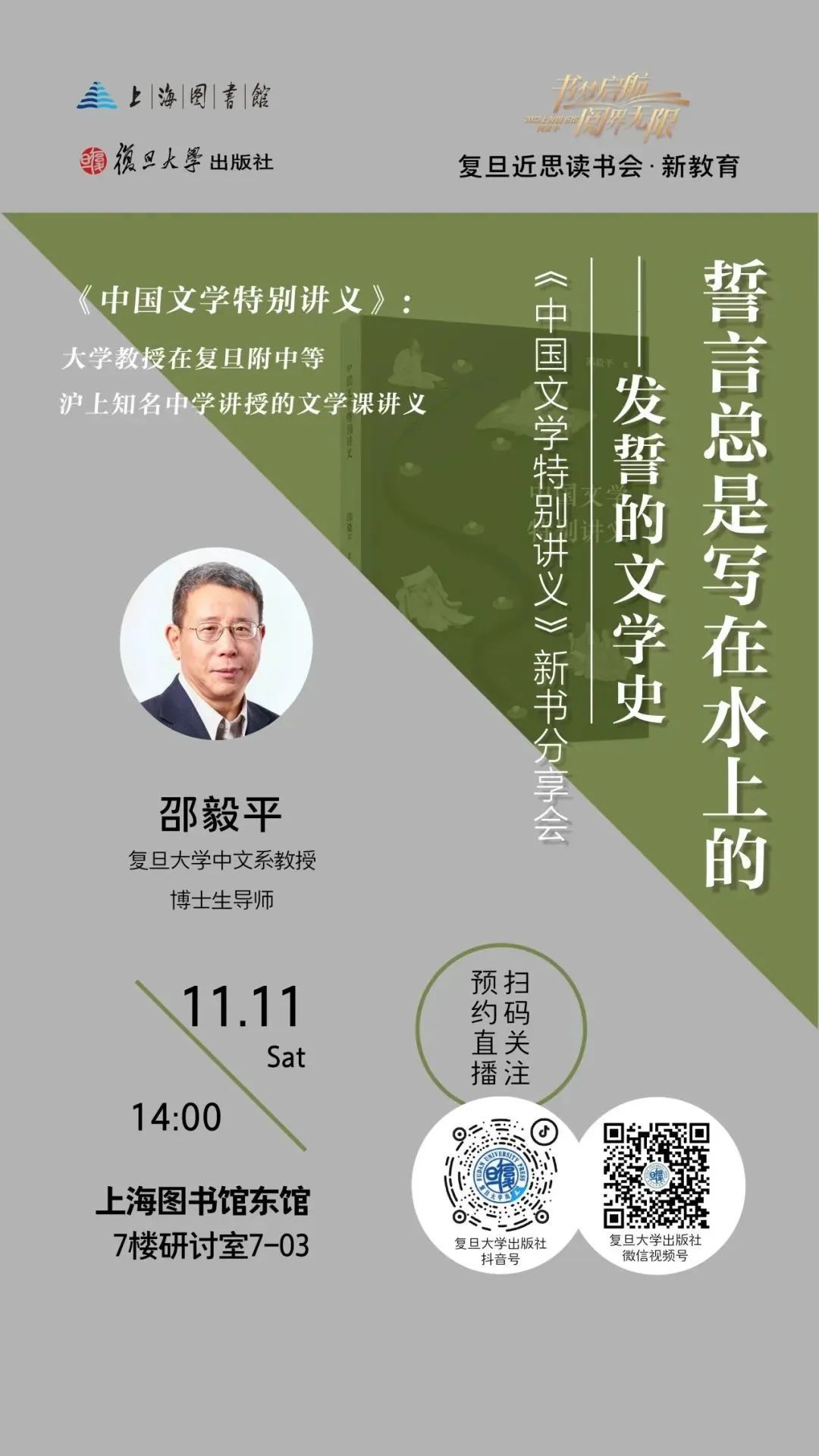 11月11日下午,复旦大学中文系教授、博士生导师邵毅平携新书《中国文学特别讲义》,在上海图书馆东馆与线上线下读者分享关于誓言的文学史,敬请期待!