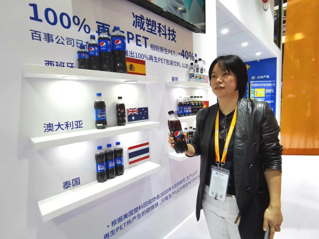 传达绿色理念的循环包装也是此次的亮点之一。百事在现场设置的智能回收机器,向观众展示了如何利用100%再生r-PET(可回收)塑料打造饮料包装的国际市场应用案例,实现了观众“零碳观展”的独特进博体验。