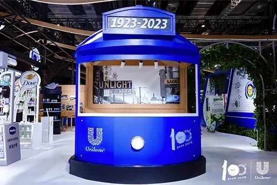 今年是联合利华进入中国市场的第100年,一辆联合利华百年时光列车驶入进博会现场。