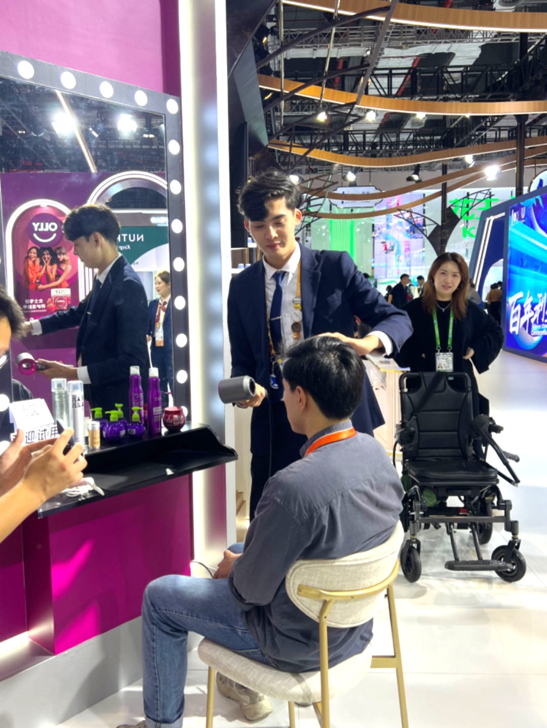 在联合利华旗下的洗护造型品牌TIGI展台前,观众还可以让工作人员现场吹头,拗一个时髦的造型,美美地继续逛展。