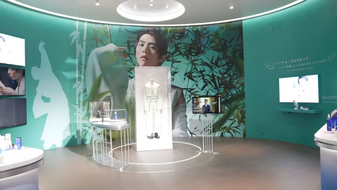 在展会现场陈列着雪肌精全球代言人羽生结弦在拍摄广告时穿着的服饰。青绿色调衣服设计精美、时尚,与高丝今年的重磅新品——雪肌精谧雅肌底乳形成了完美的搭配。不仅如此,高丝展台现场还有一面非常醒目的合影墙,参观者可以和“羽生选手”亲切合影。