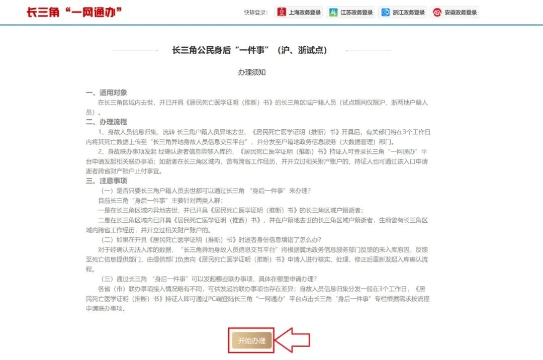 为了让逝者身后这件“伤心事”办得省心、暖心,市公安局会同市大数据中心将长三角公民身后“一件事”整合重塑。适用对象为在长三角区域内去世,并已开具《居民死亡医学证明(推断)书》的长三角区域户籍人员(试点期间仅限沪、浙两地户籍人员。年底前将覆盖整个长三角地区)。那么,办理流程有哪些?通过长三角 “身后一件事”可以发起哪些联办事项,具体在哪里申请办理?来看市人口办的解答↓ 市公安局会同市大数据中心牵头沪、苏、浙、皖四地27个行政部门围绕“减环节、减时间、减材料、减跑动”四个核心要义,对各省(市)内已上线的公民身后“一件事”进行整合重塑,通过大数据中台信息交互及异地数据核验查询等功能及机制的落地,使在长三角区域内去世,并已开具《居民死亡医学证明(推断)书》的长三角区域户籍逝者,其持证亲属可通过“长三角一网通办”总门户公民身后“一件事”专栏线上为逝者跨省(市)申办身后联办事项;同时,如逝者在长三角区域内,曾有跨省(市)工作经历,并开立过相关财产账户的,其持证亲属也可通过该入口跨省(市)为逝者申办财产账户止付事宜。目前,长三角公民身后“一件事”还处于沪、浙两地试点阶段,年底前将覆盖整个长三角地区。 办理流程 身故人员信息归集、流转长三角户籍人员异地去世、《居民死亡医学证明(推断)书》开具后,有关部门将在3个工作日内将其死亡数据上传至“长三角异地身故人员信息交互平台”,并分发至户籍地政务信息服务(大数据管理)部门。 身故联办事项发起经确认逝者信息能够入库的,《居民死亡医学证明(推断)书》持证人可登录长三角“一网通办”平台申请发起相关联办事项;如逝者在长三角区域内,曾有跨省工作经历,并开立过相关财产账户的,持证人也可通过该入口申请逝者跨省财产账户止付事宜。 热点问答 (一)是否只要长三角户籍人员去世都可以通过长三角 “身后一件事”来办理? 目前长三角“身后一件事”主要针对两类人群: 一是在长三角区域内异地去世,并已开具《居民死亡医学证明(推断)书》的长三角区域户籍逝者; 二是在长三角区域内已开具《居民死亡医学证明(推断)书》,并在户籍地去世的长三角区域户籍逝者,生前曾有长三角区域内跨省工作经历,并开立过相关财产账户的。 (二)如果在开具《居民死亡医学证明(推断)书》时逝者身份信息填错了怎么办? 对于经确认无法入库的数据,“长三角异地身故人员信息交互平台”将根据属地政务信息服务部门反馈的未入库原因,反馈至死亡信息提供部门,由提供部门负责向《居民死亡医学证明(推断)书》申请人进行核实、处理,修正后重新发起入库确认流程。 (三)通过长三角 “身后一件事”可以发起哪些联办事项,具体在哪里申请办理? 各省(市)联办事项接入情况略有不同,可供发起的联办事项也存在差异;身故人员信息归集分发一般在3个工作日,《居民死亡医学证明(推断)书》持证人即可通过PC端登陆长三角“一网通办”平台点击长三角“身后一件事”专栏根据需求按流程申请联办事项。 资料:上海发布 编辑 | 沈彦菲 责编 | 沈彦菲
