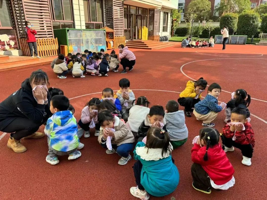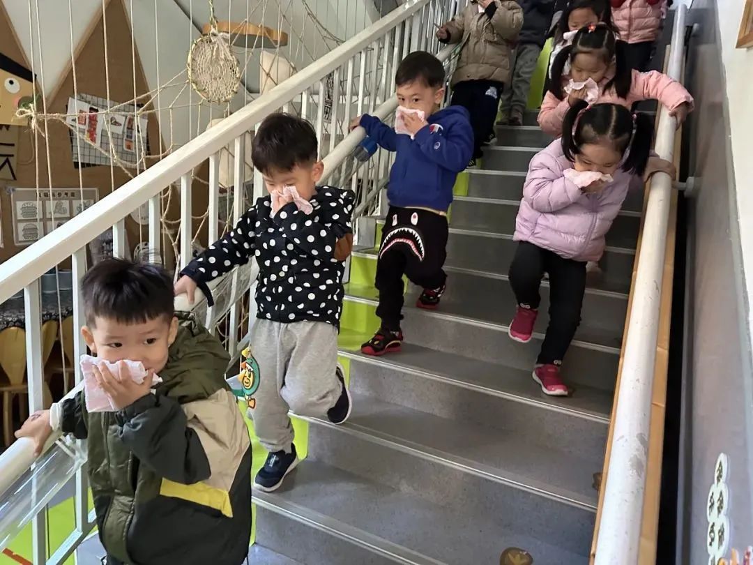 随着消防警报声响起,全体师生按照疏散路线迅速逃生。在教师有序的引导下,孩子们手拿湿毛巾捂住口鼻,低头弯腰,不慌不忙,迅速撤离到操场,各班老师及时清点幼儿人数并向总指挥汇报撤离情况。整个演练疏散顺利,全体师幼用时1分54秒全部撤离。