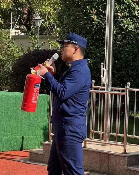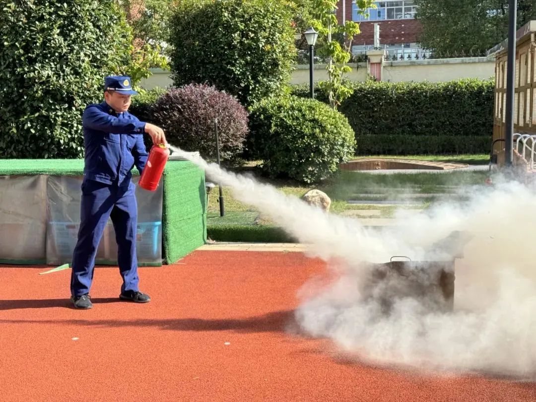 此外,消防员在操场上进行灭火演练,并讲解消防灭火器的使用方法。