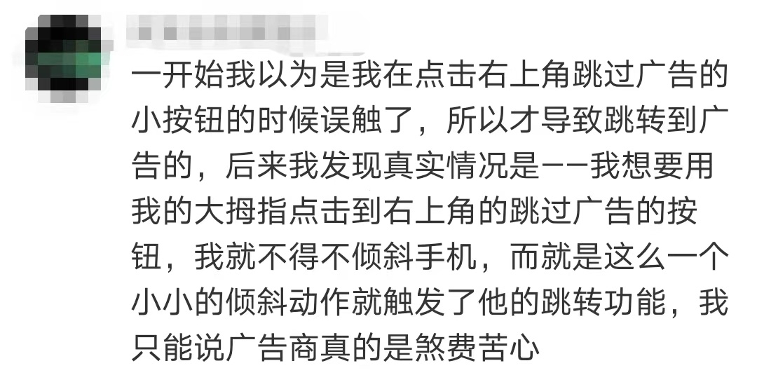 网友发现,尽管如此,跳转广告还是进化得越来越离谱,比如“摇一摇”的进阶版“扭一扭”、“倾斜”跳转。