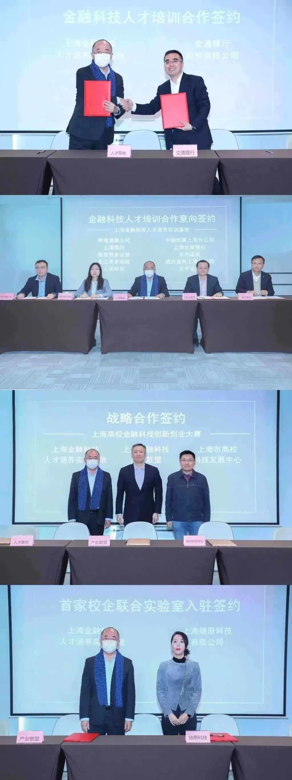 会上,人才基地还与合作方举行了四项签约仪式。第一项是交通银行金融科技人才培训合作签约;第二项是人才基地共建单位金融科技人才培训合作意向签约,共有跨境清算公司、中国结算上海分公司、上海银行、上海农商银行、长江养老保险、国泰君安证券、东方证券、沪联金科、人保科技、太平金科十家单位参与签约;第三项是联盟、市高校科技发展中心与人才基地关于“上海高校金融科技创新创业大赛”的合作签约;第四项是首家校企联合实验室入驻单位燧原科技签约。