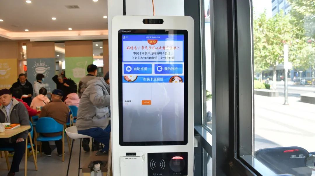 除了空间设计和基础设施方面的改造外,智能化数字设备的运用是本次社区食堂更新升级的又一大亮点。在前期调研中,不少居民反映,食堂菜品虽然丰富,但价位、种类不一,让他们选择困难。针对这个问题,社区食堂在取餐入口处安装了电子显示屏智能菜单,每天菜品种类、价格一目了然。同时,进门最显眼处还放置了自助点餐机,让不想排队的老年居民,刷一刷市民卡,就能点好一份老年套餐,大大提高了居民用餐效率。