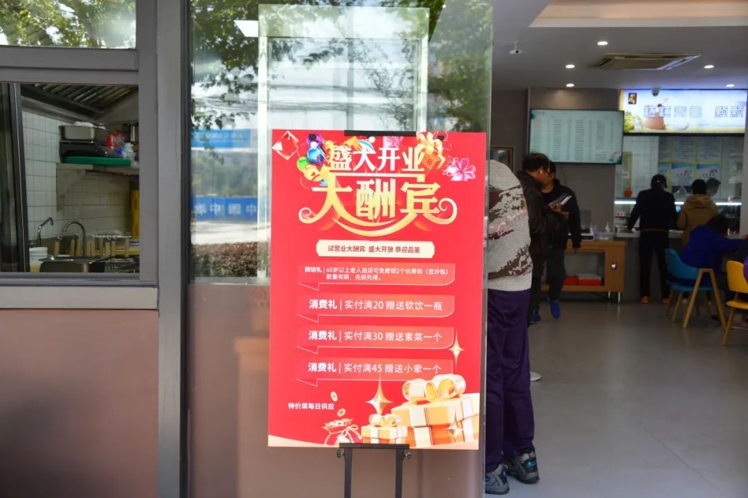 试营业期间,社区食堂还为市民朋友们提供了专属优惠。老年人凭长征镇市民卡进店可免费领取两个长寿包(数量有限,先到先得)。进店客户单笔实付满20元赠软饮一瓶;满30元赠素菜一个;满45元赠小荤菜一个。